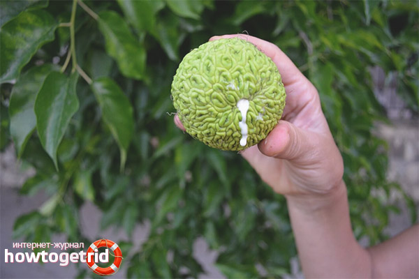 - В сложната терапия, Адам ябълка може да се използва за възпаление на хемороиди, високо кръвно налягане. В допълнение, вътрешният прием на смеси на базата на плодовете на макура ви позволява да унищожите вредните микроорганизми и да увеличите защитните сили на организма. За приготвяне на използваните лекарства и плодове, както и пресни листа и клони на дърво. Трябва да изберете големи и узрели плодове. Техният цвят е жълтеникав.