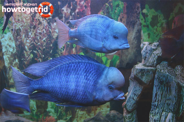 Синият делфин (Cyrtocara moorii) трябва да се отнася към аквариумните цихлиди. Тя произхожда от африканското езеро Малави. Неговата популярност се дължи основно на оцветяването и необичайната форма на тялото, на която има голяма мазнина. Много е трудно да се нарече този представител много малък, тъй като той може да нараства по дължина при условия на робство до 25 см. Понякога размерите могат да поемат големи количества. Рибите са миролюбиви, но мъжете са доста агресивни и често се разхождат помежду си.