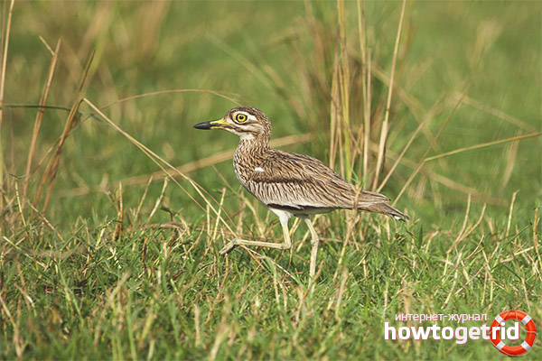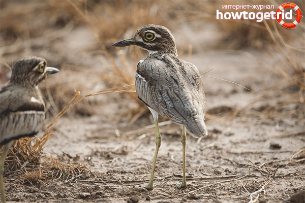 Оперението е доста странно - всяко бяло сиво перо е украсено с лека ивица и тъмно кафява пепел.Този цвят служи като отлична маска, която ви позволява да се скриете в сухата трева от миналата година. Тънки и дълги крака - жълти, по-голямата част от човката има същия жълт цвят, само върхът е черен. Оперението на гърдите и корема е бяло, с няколко черни ивици на гърдите. Отвън мъжете и жените трудно се различават - нито по цвят, нито по размер.