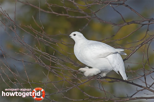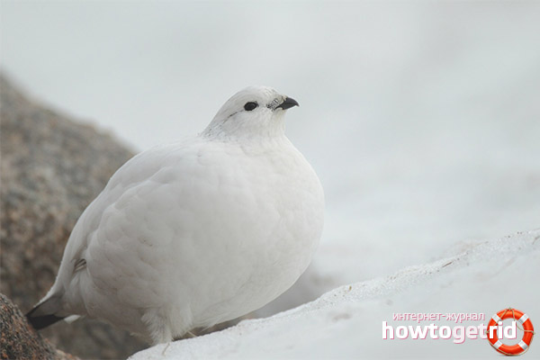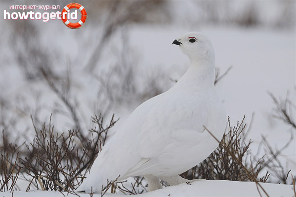 - Индивидите на женски пол променят зимното си облекло по-рано от мъжете от семейството. Те се превръщат в бели, в областта на опашката има само черни пера. Дебелото и късо оперение хленява зоната на лапата. Благодарение на тези функции, птиците се сливат с околните, се скриват от враговете си и могат да оцелеят през зимата.