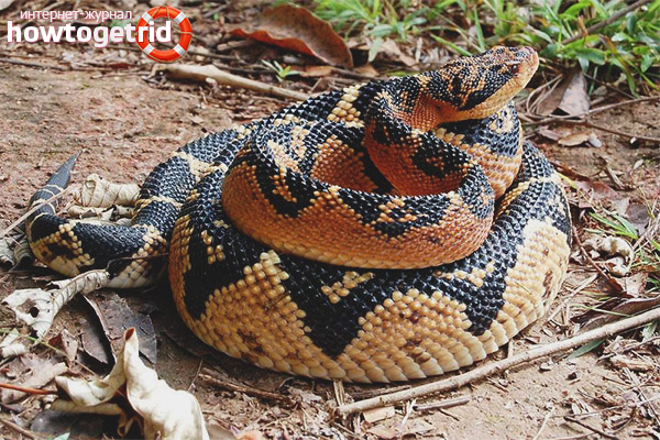 BushMaster е голяма отровна змия от семейството на усойница, средната дължина на тялото е 2.5-3.5 метра, а теглото му е до 5 кг. Бих искал да обърна внимание на факта, че този вид влечуги е най-големият от всички членове на семейството и всички видове змии, живеещи в Южна Америка.