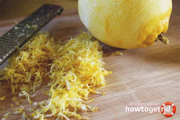 За да намалите лимоновата кора, се нуждаете от остър нож, защото от плода се отстранява само тънък слой.Обелете се чрез триене на нарязаната кожа с ренде и трябва да се уверите, че само жълтият слой от кожата е изтрит, в противен случай ястието ще се окаже горчиво.