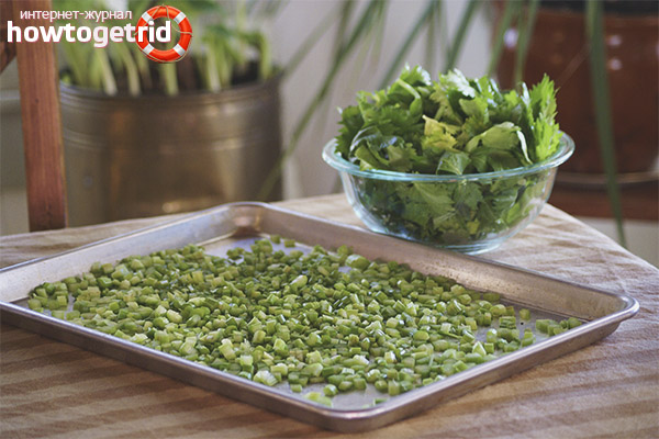 Методът се тества през годините. Дръжките от целина се изплакват с течаща вода, частици от почвата, пясък и други замърсители се отстраняват, изтриват се с кърпа. Целият или нарязан зеленчук се поставят върху пергамент и се покриват със същия лист хартия отгоре. Целина трябва да се остави да изсъхне при стайна температура (около 1 месец). Сухите резници се съхраняват в стъклени изделия. Ако е необходимо, вземете го и готвяйте.Зеленчуците могат да бъдат раздробени в блендер, превъртани в месомелачка, шлайфани в хаван или използвани като подправки.