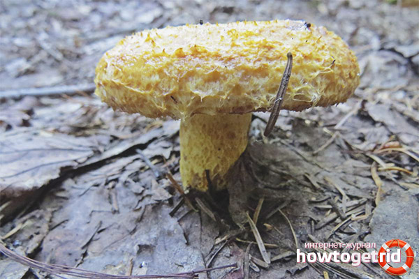 - Ако окажете натиск върху шапката, тя ще промени цвета си до лилаво. Плочките са разположени близо един до друг, те са тесни и падат върху основата. Те са боядисани със светложълт цвят, но при пресоване стават сини. База кръгла форма, тънък в началото, расте на височина от 8 см. С дебелина 3 см.