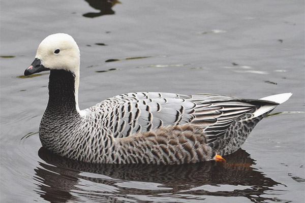 Основната разлика между гъска - белезникава от останалите роднини беше оцветяването му. Той изглеждаше облечен в верижна поща с малки пъстри връзки и само главата и шията останаха бели. Синият тон със сив нюанс създава невероятен контраст с кафява гърда и бяла глава. Елегантното оперение не е поразително, но изпълнява защитна функция. Птицата е трудно да се види сред крайбрежните камъни и дори по-трудно да се види в блестящите морски вълни.Теглото на възрастен индивид варира между 2,5 кг, късата дебела шийка се е превърнала в отличителна особеност на вида. Няма особена разлика между цвета на мъжката и женската.