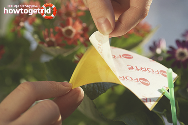 Те могат лесно да бъдат направени самостоятелно. За да направите това, имате нужда от дебел картон с ярко жълт цвят. След това се покрива с петролно желе, рициново масло и смес от колофон и мед. Те са закрепени върху държача на метал или дърво.Можете да поставите такива капани директно в гърнето, ако растението вече е ударено от насекоми или на прозореца. В оранжерията на един капан достатъчно за 10 квадратни метра. м.