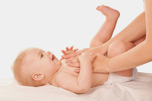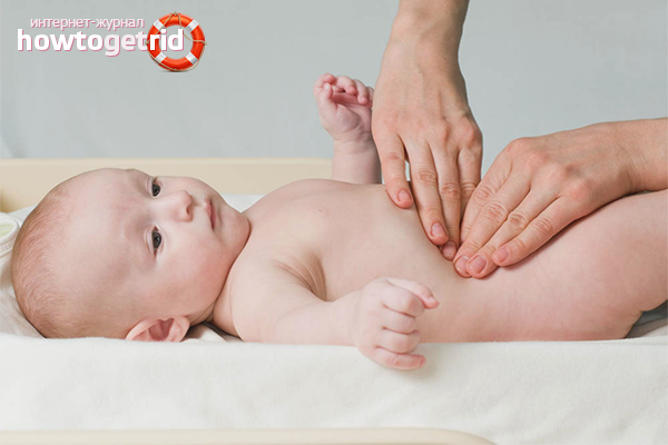 - За да изгладите корема на новороденото с длани, огънати във формата на лебедка.Преместете се от хранопровода до пъпа, леко натискане.
