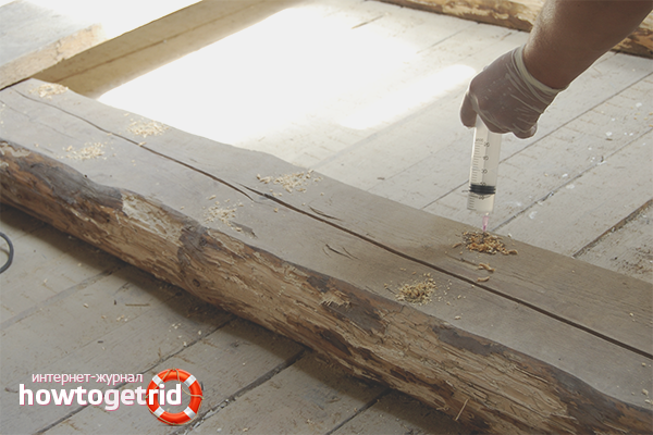 - В продажба има много специални решения, специално разработени за изкореняване на короятен бръмбар в къщата. Използвайте ги. Но и тук има нюанс: обикновено са необходими 2 лечения за това лечение, един от които е антисептичен, а другият е забавител на пламъка (забавител на пламъка). Те се поставят непременно отделни слоеве, оставяйки да изсъхнат всеки в рамките на един ден.