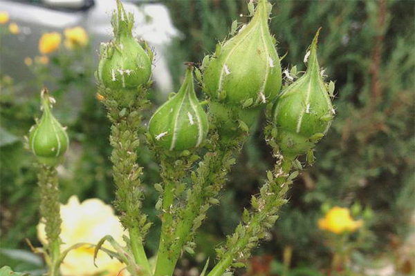 Зелените рози се напръскват с отвара от пелин. Пригответе възпиращо средство от 2 кг сурови или 700 г сухи суровини. Тревата се изсипва върху 10 литра вода, варена за 15 минути, настоява за 4-5 часа. Бульонът не се нуждае от разреждане. Филтрува се и веднага се излива в бутилка със спрей. Липно пръскани листа, пъпки и корените на храстите. Лечението се повтаря след 7 дни. Афидите изчезват след втората или третата процедура.