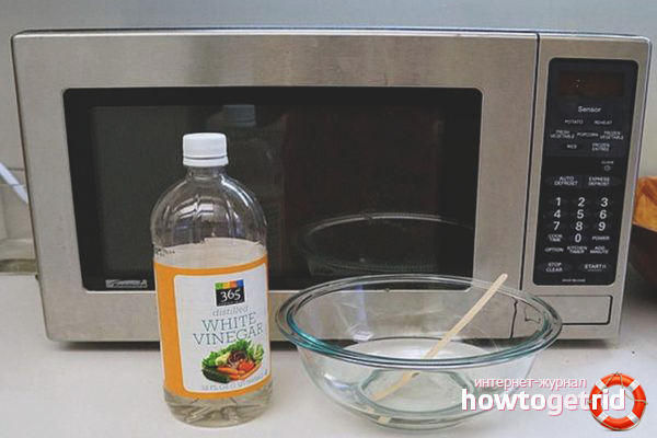 - Вземете малък контейнер за микровълновата фурна, налейте в нея пречистена вода около половината от общия обем. След това добавете 60 ml към контейнера. 9% оцет.