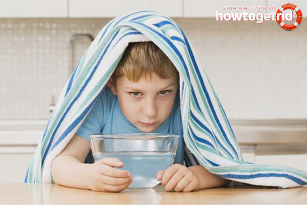 Малките деца изпитват трудности да вдишат, така че трябва да използвате този съвет. Изсипете течността в тавата и я поставете на максимален огън. Качулката не се включва, вратата в кухнята е затворена. Взимаме детето в ръцете му и се изправяме до тавана. Детето бебето невероятно ще вдиша изпаренията и ще има положителен ефект върху възпалената трахея.