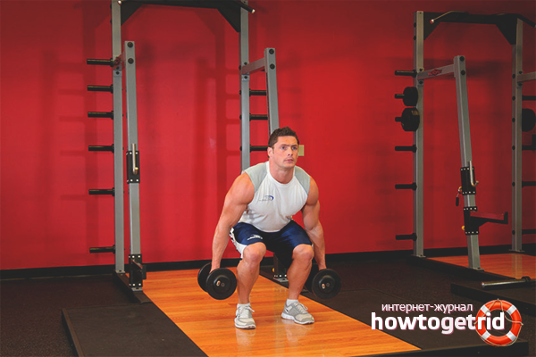 - Едно от най-ефективните упражнения за крака е клек. Докато правите клякам, не е нужно да вървите надолу, за да не навредите на коленете си. Когато правите упражнението, поставете краката си малко по-малко, това ще ви позволи да изпомпате не само мускулите на бедрата и телетата, но и задните части. Обикновено клякамите са лесни, така че можете да усложнявате задачата и да добавите товар. Това може да са обикновени дъмбели или дискове за бара. Ако няма специални устройства, използвайте раница с тухли или бутилки вода. Оптималният тегловен агент трябва да тежи около 20-30 кг.