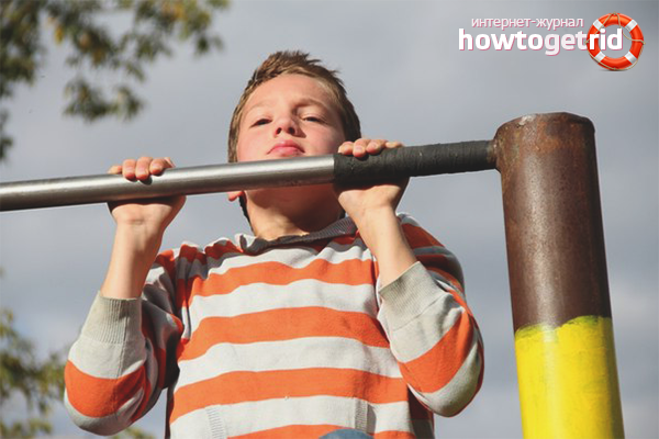 За начало детето трябва да издържи до позицията "брадичката над напречната греда". Това се прави с помощта на стените. Детето просто почива на коленете си на стената, така че краката му се изтласкват и се издигат над нивото на хоризонталната лента. След това момчето трябва да свали краката си, да ги лиши от подкрепа. След това трябва да слезете в началната позиция, но възможно най-бавно. Това означава, че мускулите на детето са обучени в обратната посока, тъй като тялото му е свалено. Това е малко по-лесно да се направи, но това е също толкова ефективно.