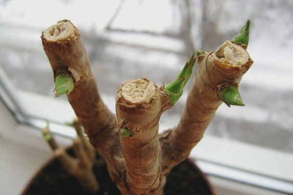 Премахнатите части от dracaena не трябва да бъдат изхвърляни. Заготовките могат да бъдат покълнали в чаша с топла вода или в контейнер със сфагнум. Кълнове, които са придобили свои собствени корени, се засаждат в саксия, в която живее стъблото на майка си, или в нов малък съд.