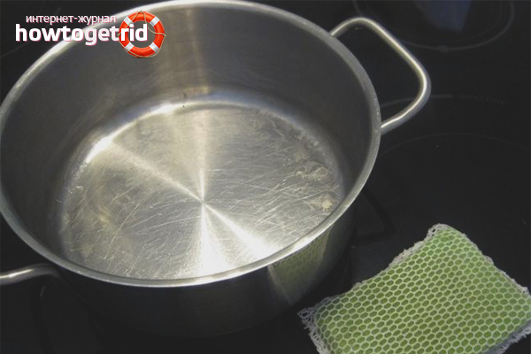 След това просто трябва да излеете в тенджерата вряла вода и добавете две или три супени лъжици сол (важна, не студена, в противен случай ще има вредно въздействие върху тенджерата) и оставете съдовете самостоятелно в продължение на един-два часа. След тези операции ще бъде много по-лесно да отстраните въглеродните отлагания, но трябва да отбележите, че в никакъв случай не трябва да използвате твърди абразивни четки: макар че те изливат изгорялата храна перфектно, в същото време те оставят микрокредити, които ще бъдат излекувани в бъдеще със сол или други сажди.