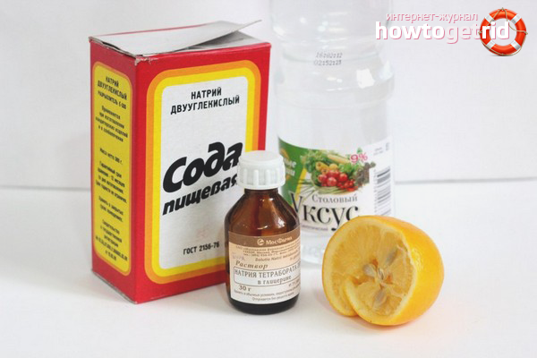 - Соди и водороден пероксид. Ясно оцветени и упорити петна могат да използват сода и водороден прекис. Смесете двете съставки, така че суспензията да се окаже. С помощта на четка леко нанесете сместа върху петна и я оставете за няколко часа. Тази композиция ще ви помогне да премахнете дори най-трудните места и мръсотия.