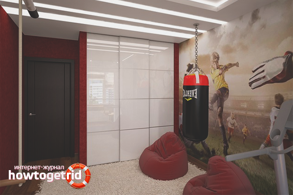 Възможно е да се оборудва спортна стена в детската спалня с хоризонтален бар, стълба, гимнастически пръстени и круша. Този комплекс ще допринесе за цялостното физическо развитие на детето, както и ще насочи неудържимата енергия на детето в правилната посока.