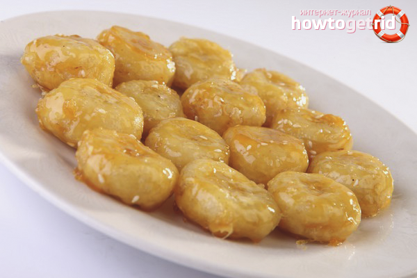 - Нарежете банана на надлъжни резени, поръсете брашно от всички страни. Смажете в олио, охладете, преместете се в чиния.