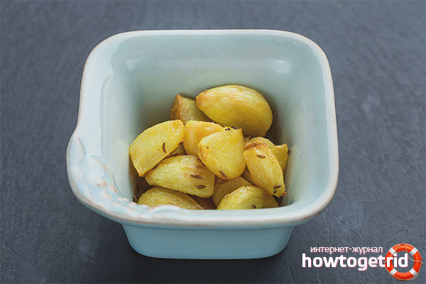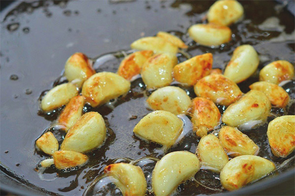 При печене на чесън се променя вкусът. Ако в неговата сурова форма той изгаря както обикновено, след това в пържено тя става ароматна и мека, не предизвиква усещане за парене в устата и съпътстваща миризма след хранене.