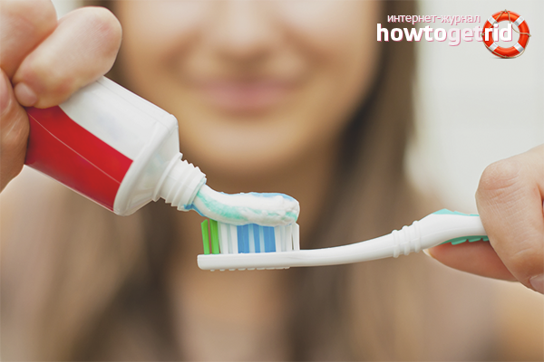 - Вземете четка за зъби в ръката си, изплакнете първо с кипяща вода и след това с вода в стайна температура. След това поставете върху четините малко паста, размера на граховото зърно. Не е забранено да се използва повече почистващ продукт, но пяната се натрупва в устата, създавайки неудобства.