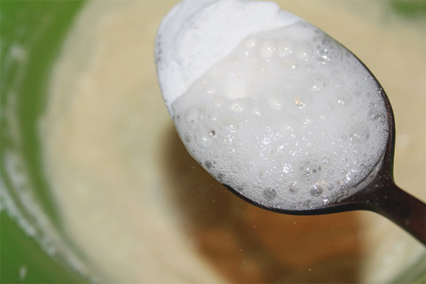 - При печене се получава малък резултат. По този начин, химичният състав, когато взаимодейства с температурата или млечните продукти, вдига тестото.