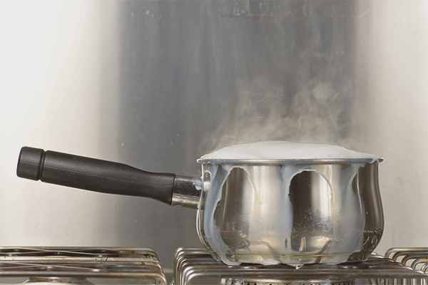 - Изплакнете резервоара за варене и изсипете малко чиста вода (една чаша) в него. Когато водата се свари, добавете малко мляко към него. Това се прави, за да се провери млякото за свежест. Ако млякото започне да се изключва, то е кисело - по-добре е да не се вари. Можете да направите палачинки или палачинки от такова мляко и не се препоръчва да се пие в чиста форма. Ако млякото не е навито, можете да добавите останалата част от продукта. Не се притеснявайте, че сте разреждали млякото с малко количество вода - той ще се изпари бързо.