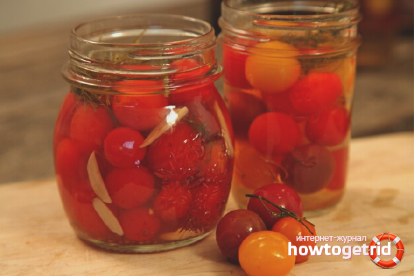 - Изсипете разтвора в бурканче от черешови домати, навийте се с капачки от калай. Завъртете контейнера с главата надолу, поставете кърпата, оставете за 3-4 часа, докато се охлади напълно. След това вземете банките в тъмната стая. След 4 седмици може да се сервират домати.