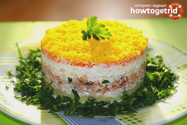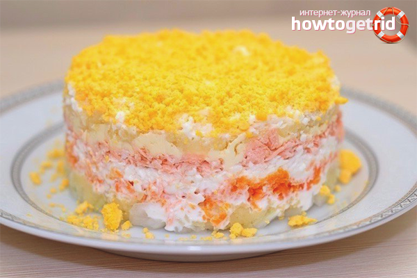 - Изброените компоненти се напояват с майонеза, след което се скриват зад пулверизирания протеин, останалата риба и настъргания лук. Смейте салата отново.