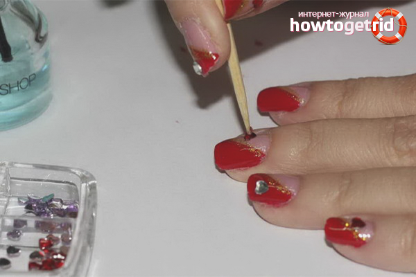 Преди да използвате камъчетата директно, подгответе ноктите си: ги махнете и ги полирайте, премахнете кожицата. Закрепете кристали за лак или специално лепило, вземете ги с игла / клечка за зъби. Изведете чертежа с тънка четка, за да видите по-добре пътя, по който ще бъдат разположени декоративните елементи.