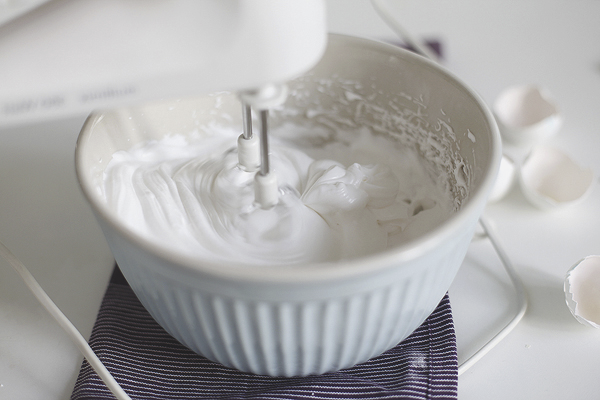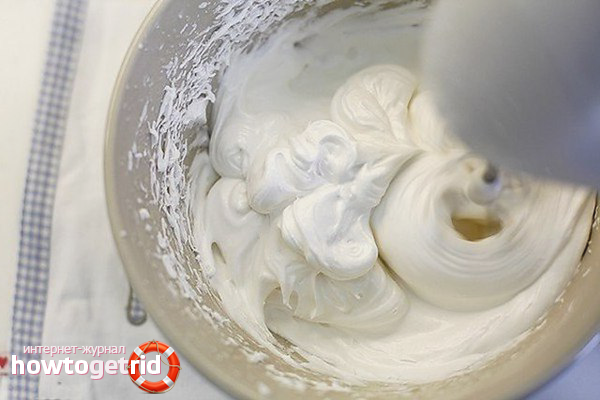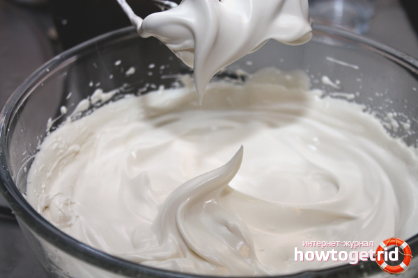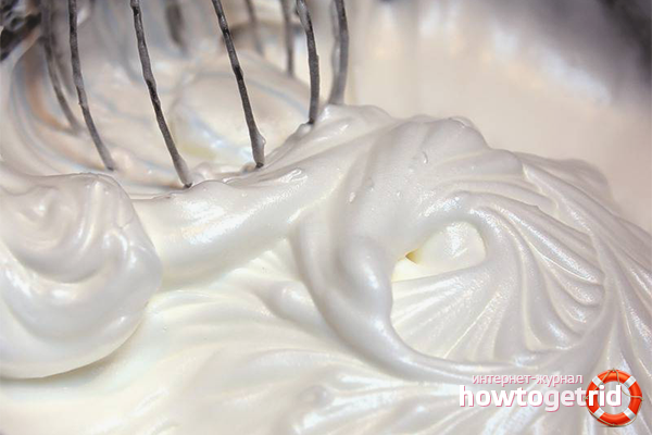 - В сух контейнер с ниско съдържание на мазнини грижливо победете охладените протеини до гъста пяна. По време на смесване на масата, изсипете лимонена киселина.