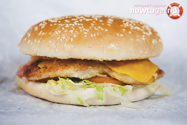 - Cheeseburger е двуфазен сандвич (сандвич), в който пълнежът е обвит в кръгъл хляб. В допълнение към хлебната основа, Cheeseburger включва и други съставки. Те включват домат, лук, кисели краставички, разтопено сирене, месо котлет (за предпочитане от свинско и говеждо), сос.