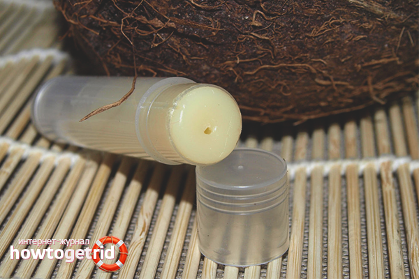 Ще ви трябва чаена лъжичка кокосово масло, какаово масло и восък. Ще трябва да добавите 1,5 ч.л. рициново масло. Ако не може да се купи рядко кокосово масло, може да се приготви сами. Необходимо е да се настъргва пулпата от кокосов орех върху фин ренде, да се залее с вряла вода над нея и да се постави в хладилника за една нощ. На следващия ден ще се появят парчета кокосово масло над водата.
