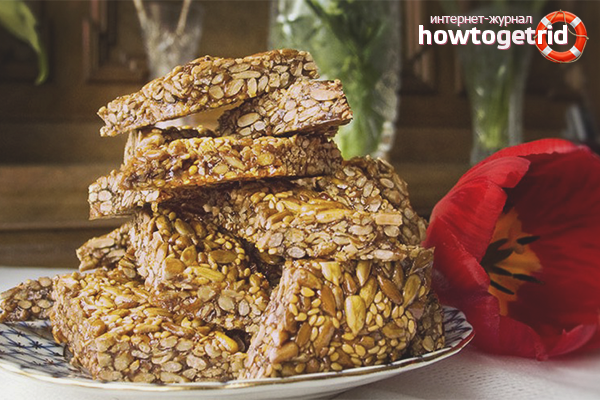 Тъй като козинаки е доста деликатен калориен десерт, ние ще се опитаме да подготвим диетата си. Такива kozinaki без страх можете да ядете диабетици, алергии, както и тези, които се интересуват от тяхната фигура. Така че, за диетичните козинаки се нуждаем от семена, малко фъстъчено масло, няколко супени лъжици сусам.Всички сухи съставки трябва да се запържат в тиган до лека хрупкавост. Фъстъците могат да бъдат раздробени на няколко части или оставени непроменени. Вместо сироп и сладък компонент ще използваме банан. Пъхнете няколко банани в блендер, добавете щипка кардамон и малко канела. След това трябва да смесите всички съставки. По-добре е да смесите всичко с ръцете си, така че всяко семе и орех да са в бананова черупка. След това извадете слоя с подвижен щифт и го изрежете с нож на парчета. Можете също така да подредите kozinaki под формата на бисквитки - изрязани фигури от резервоара със специални форми. Оформените козинаки се изпращат във фурната, за да изсъхнат. Дръжте ги там е необходимо около половин час при температура от 180 градуса. Оставете козинак да се охлади и да се наслаждава на вкуса си, без да навреди на здравето.