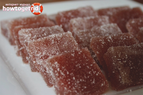 - Смесете и двата съставки помежду си, опаковани в клетки с форма. Оставете мармаладата в хладилника за 3 часа, така че да е напълно замръзнала. След това поръсете продукта със захар.