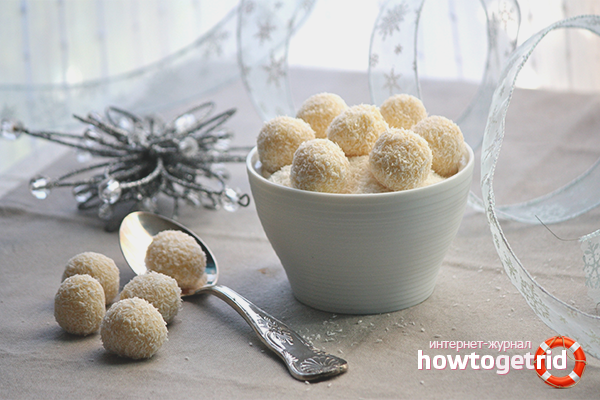- Вземете кремообразната маса, извадете топките от нея, навийте в разтопения бял шоколад. След това незабавно се поръсва с кокосови чипове и се поставя на табла. Оставете на студено, докато се втвърди (около 3 часа).