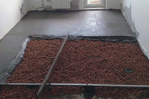 След това шумоизолиращи плочи се поставят върху бетонната основа или се излива шумоизолиращ материал. Какво може да извлече парите, а след това да ги прикачите. Сега дебел филм се полага на горната или звукоизолираща мембрана. На припокриването на стената е прикрепена маскираща лента.