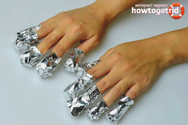 - Вместо ацетон, по-добре е да използвате специалния инструмент AcrilikRemover за премахване на акрилни нокти, шеллак, гел нокти. Произвежда се от различни производители, има форма на течност, мазилка, спрей, но методът на приложение е еднакъв. Продуктът се нанася върху нокътната плоча, увит във фолио, времето се оставя да изчака 10-15 минути, фолиото се отстранява и акрилното покритие се отстранява от само себе си. В редки случаи козметичният длето идва за спасяване.