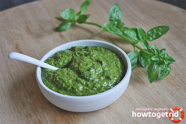 Този метод на дългосрочно съхранение е доста интересен. Трябва да вземете босилек, изплакнете добре и премахнете плевелите. Една струйка от растението ще изисква около 50 грама зехтин и малко (за вкус) сол. Всички съставки се поставят в смесител или специален разтвор за шлайфане. Това превръща ароматните макаронени изделия в тъмнозелени. За да съхранявате пастата, трябва да се разложите на брега и да се разтопите. Оригиналният метод на съхранение е да се разпръсне масата във форми и да се замразява.Такъв продукт винаги може да бъде добавен към всяка чиния, особено през зимата. Всяка храна ще бъде много по-вкусна и по-здравословна.