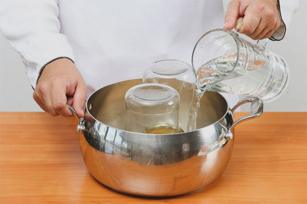 Съдът трябва да бъде напълнен с топла вода, така че да не достигне шията на кутиите на около 5 см. След това поставете пота в огъня. Времето за пастьоризация зависи от специфичната рецепта, като правило, отнема 15-25 минути след вряла вода.