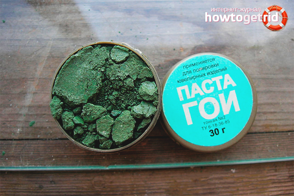 - Паста GOI. Тя получи името си в чест на Държавния оптичен институт, където е създаден. Това е хром оксид, има зелен цвят, но поради неговите канцерогенни свойства, пастата е преустановена. Вместо това, един аналог, базиран на алуминиев оксид, се появява в червено или бяло. Целта на пастата е да полира повърхността и да я изглади и да премахне малки драскотини. През съветските времена се използваше да се търкат оптиката, различните инструменти и звена. Те също се почистват с бижута, офис оборудване и напоследък екрани със сензорен екран. За да направите това, нанесете малка ПИ върху памучен тампон, поставете няколко капки моторно масло върху екрана и го разтрийте.Когато всичко се абсорбира и повърхността става гладка и гладка без пукнатини или драскотини, я избършете с чиста кърпа от микрофибър.