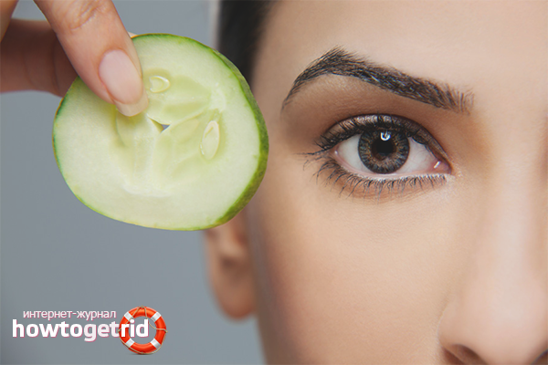 - чаши прясна краставица, приложени към затворени очи за 15 минути.