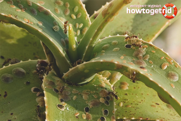 - Алое има вредители, които причиняват много проблеми на растението. Мелибуг е доста голямо насекомо, което може да бъде отстранено на ръка или с помощта на пинсети. Ако сте забелязали такъв неканен гост, лекувайте листата с тинктура от чесън върху алкохол или специални инсектициди. Пръскането на растението със студена вода ще помогне срещу паякообразни акари.