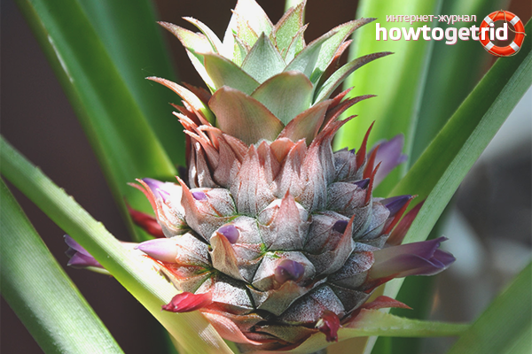 След два месеца растението започва да цъфти. Тя трае около 10-14 дни. Ананаси цветя обикновено са сини и цъфтят един след друг само за един ден. Веднага след като последното цвете изчезне, започва развитието на плодовете. Пълната зрялост настъпва след 4-6 месеца.
