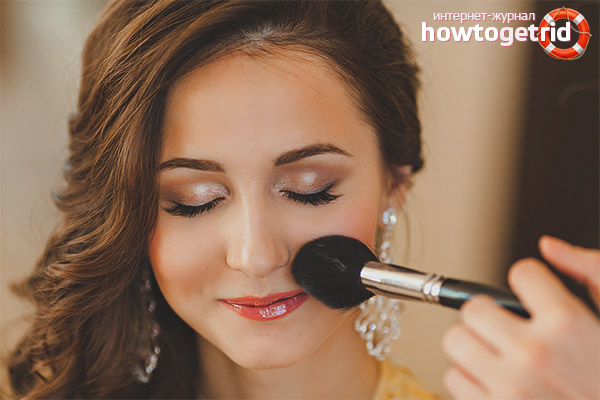 - Над праха се разпределя руж. Не е необходимо да се взима кафяв тон, което прави лицето мрачно. Предпочитайте червен розов или прасковен руж. В зависимост от формата на лицето, те се прилагат върху или под скулите и внимателно избелени.