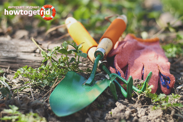 - Избиране на корен. Тази опция е най-трудната и дълга. Тук се препоръчва да не използвате лопата, а вилката, защото лопатата само ще отреже корена и частите му ще останат в земята. Pitchfork също трябва да вземете трева и да я издърпате от почвата, опитвайки се да не повредите кореновата система. След това трябва да разклатите тревата от тревата и да я изхвърлите от градината.Макар и вариант и отнема много време, но много ефективен.