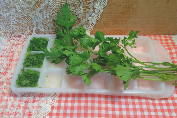 Ако искате да съхранявате зелените в тави, е по-добре да го бръкнете с ръка предварително, така че повече зеленчуци да се поберат в контейнера. Когато сте замръзнали в тави, можете допълнително да използвате обвивка с храна, първо да я покриете и след това да затворите капака. След внимателно опаковане на магданоз, тавите се поставят във фризера. Удобството на заготовките в тавите е, че зелените в тях се оказват сухи, благодарение на което в бъдеще е много удобно да ги вземете с една чаена лъжичка или супена лъжица. Важно е да не забравяте, след като ядете правилното количество магданоз, за да поставите тавата обратно в хладилника.