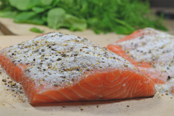 След избора на филе или пържола, пристъпете към осоляване на червената риба. Винаги помнете, че класическата рецепта за 1 кг. продуктът се взима 70 грама. (2 супени лъжици L.) Нарязана сол и 35 гр. (1 супена лъжица L.) захар. Това е класическа технология, практикувана в много страни.