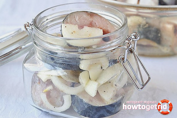 - Нарежете два трупа на еднакви парчета, смажете всяка част с приготвената свободно течаща смес както от вътре, така и отвън. Поставете рибата в стъклена буркан или пластмасов контейнер, поръсете с остатъците от осоляване отгоре.