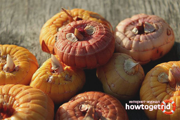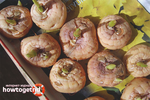 За да сте сигурни, че бъговете не се връщат, можете да потапяте всички крушки в гореща вода (около 50 градуса) за 5-7 минути. Уверете се, че сте изсушили добре, така че гъбата да не започне в мокрия материал за засаждане.