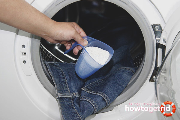 - Когато гранулите на добавения агент се смесват с вода, поставете джинсите в разтвора. Правете пране с четка за дрехи или с ръцете си. По желание можете да изпращате дънки на машината.
